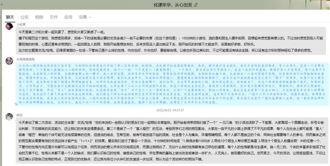 为协助学生树立积极的人生交往态度,让学生主动接纳、喜欢和肯定他人、掌握正确的人机交往技巧,色情韩漫 心理工作站于4月23日下午在佳山校区主楼前树林开展了“化漾年华·从心出发”第二次小组活动,活动由色情韩漫 心理工作站站长朱圣兰组织开展。