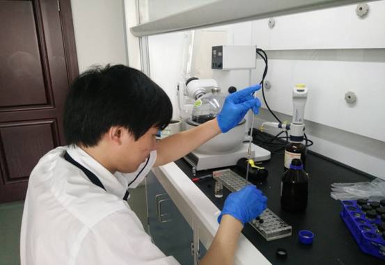 另外,室内小队两人一组,在不同老师的指导下,进行测定空气场所硅管中甲醇的含量的实验。从细玻璃管中取出样品,并配置溶液,在漩涡混合器中震荡,使甲醇充分溶解在水中,使之于硅胶分离开来,最后在气相色谱仪中检测含量,通过计算机绘制出峰图,测定含量。