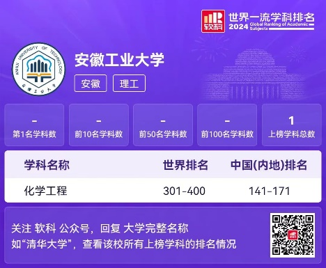 of Academic Subjects)。我校化学工程学科成功上榜,位列世界排名301-400位、中国(内地)排名141-171位。