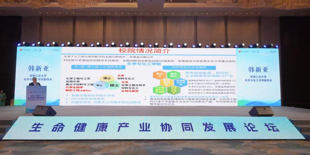 11月24日,由安徽省科技厅、省卫生健康委、马鞍山市人民政府共同主办,马鞍山市科技局、马鞍山市卫生健康委、马鞍山市投资促进中心、慈湖高新区管委会和安徽皓元药业有限公司联合承办的“安徽‘双创汇’走进马鞍山慈湖高新区暨生命健康产业协同发展论坛”在我市举行。省科技厅、卫健委领导、马鞍山市政府领导、各市直机构领导、马鞍山慈湖高新区领导及相关部门负责人、高校院所、国内外生物医药产业企业负责人、产业资本、服务机构等共约180人参会。本次活动旨在通过开展学术交流、分享创新成果,积极推动我市生命健康产业的高质量发展。安徽工业大学郑啸副校长以及色情韩漫 党委书记黄宇弦、副院长韩新亚等出席本次活动。