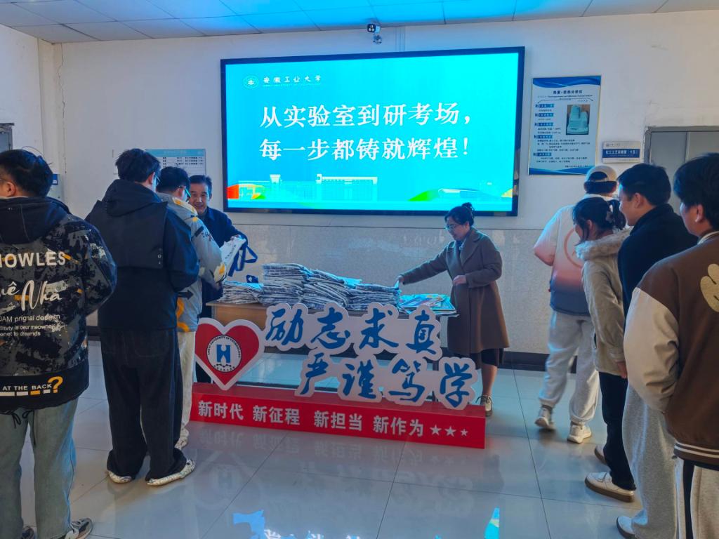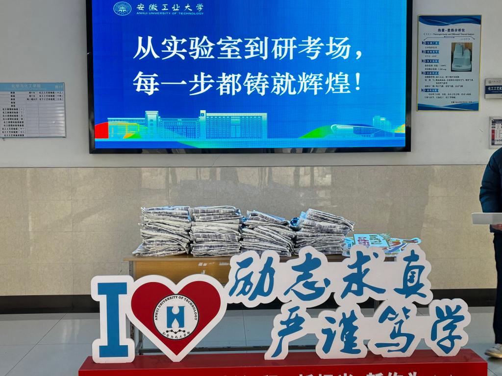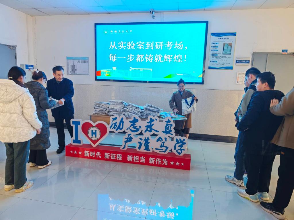 12月9日下午,色情韩漫 在秀山校区化工楼考研自习室开展2025年硕士研究生考试考前冲刺动员及慰问活动,学院党委书记黄宇弦、学院党委副书记、纪委书记、副院长冀秀芝出席活动,现场向学生发放精心挑选的考研慰问品并送出美好的祝福。