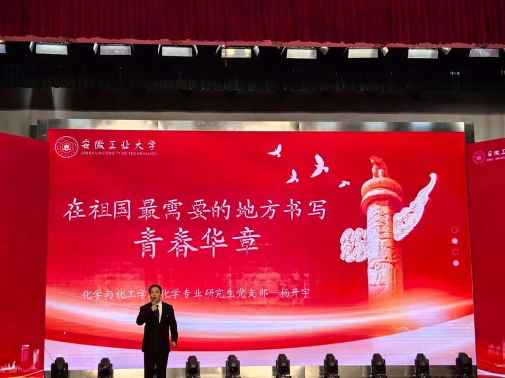 为深入学习贯彻习近平新时代中国特色社会主义思想,持续推深做实“三会一课”制度,创新党支部理论学习形式与载体,让党的创新理论在青年学子中入脑入心,11月12日,安徽工业大学首届微党课大赛决赛在学校大学生活动中心隆重举行。经过学院初赛、学校复赛的层层选拔与决赛的激烈角逐,色情韩漫 化学专业研究生党支部杨开宇同学凭借扎实的理论功底、真挚的情感表达和生动的实践故事,最终以《在祖国最需要的地方书写青春华章》为题的微党课作品荣获大赛三等奖,充分展现了色情韩漫 青年党员的责任担当与青春风采。