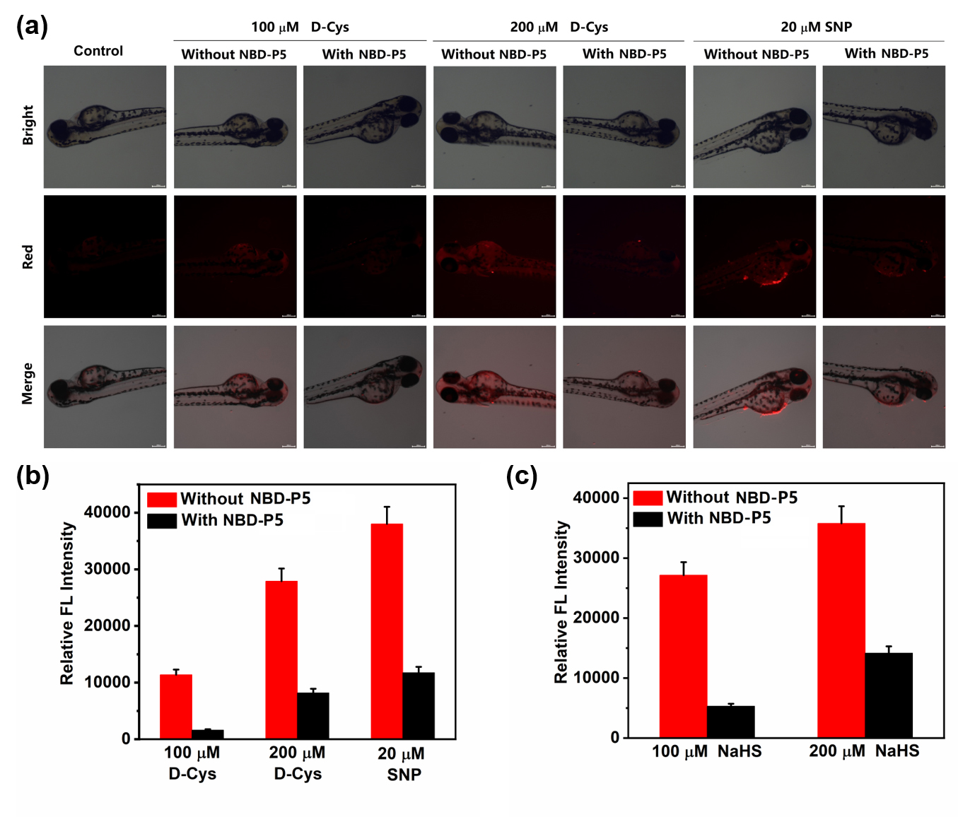 针对当前H2S清除剂检测范围较小的问题,本研究以高荧光量子产率、生物相容性较好的硝基苯并噁二唑荧光团、哌嗪连接基团为原料,构建了一系列H2S清除剂(NBD-P1−NBD-P5)。NPD-P5对H2S具有优良的选择性和消除能力,与以往报道的H2S清除剂相比,NBD-P5具有快速的响应时间(3 min)、更宽的线性响应范围(200-600 μM),适用于癌细胞中高浓度的H2S的快速分析和浓度下调。此外,NBD-P5能够显著清除活细胞和斑马鱼体内的内源性H2S,证实NBD-P5在复杂的生物系统中也能下调H2S浓度。这些数据表明NBD-P5具备发展成一种有效的生物体内H2S清除剂的潜力,有望应用于H2S相关疾病的分析和诊疗研究。