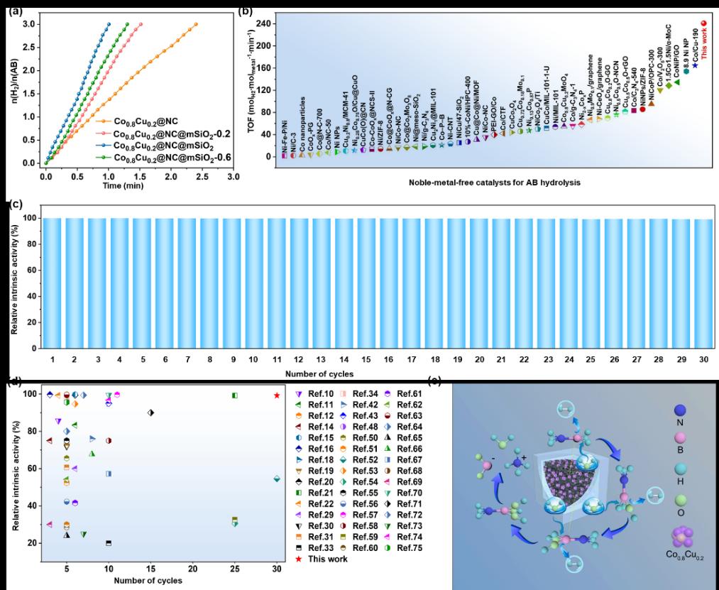 氢气的能量密度高(120 MJ·kg-1),使用时仅产生水作为副产品,被认为是最有前途和最环保的能源。高效的储氢技术仍然是实现氢燃料电池规模化应用的重要挑战。氨硼烷(AB)因其高达 19.6 wt.% 的储氢质量密度而被认为是最有前景的化学储氢材料。但AB水解的制氢动力学在室温下较为缓慢,因此寻求高效催化剂来促进这一反应是当前研究的重要方向。