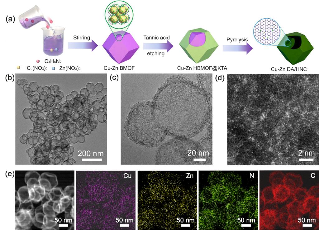 本研究利用柯肯达尔效应成功构建了N桥连Cu-Zn 双原子催化剂,Cu和Zn原子之间共享的N原子有利于增强双原子间的协同效应,有利于与O*结合,降低ORR反应能垒。所得到的N桥连Cu-Zn 双原子催化剂在碱性电解质中表现出优异的ORR活性,所构建的锌空气电池可以在空气中稳定充放电运行近900小时左右。