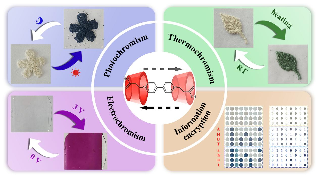 近年来,能够对外部刺激(例如光照、温度、电场、磁场、pH值和压力等)进行响应的变色材料引起了广泛关注。这些变色材料在智能窗户、电子显示器、存储设备、光学开关和化学传感器等方面有较好应用前景。目前已经报道的刺激响应变色材料,大多数仅可以对单个或两个外部刺激产生响应,对于具有多重刺激响应变色行为的材料的研究还相对有限。然而,某些特定的应用,如多重防伪和多层级信息加密,则要求同一材料能够响应三种或更多种外界刺激而产生变色。因此将多个官能团整合到同一个化合物中并构建多重刺激响应的变色材料仍然具有挑战性。