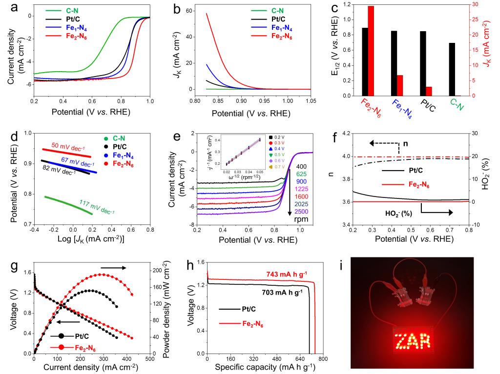 氮配位的铁-铁双原子对相较于氮配位的铁单原子和商业铂碳催化剂,在碱性介质中表现出更高的起始电位(0.95 伏)和半波电位(0.90伏),以及更高的动力学电流密度和更低的塔菲尔斜率。此外,基于氮配位的铁-铁双原子对的柔性锌空气电池在平展和弯曲状态下均能点亮发光二极管,显示出优异的机械稳定性和应用潜力。这些结果验证了氮配位的铁-铁双原子对作为高效氧还原催化剂和柔性电池电极的卓越性能。