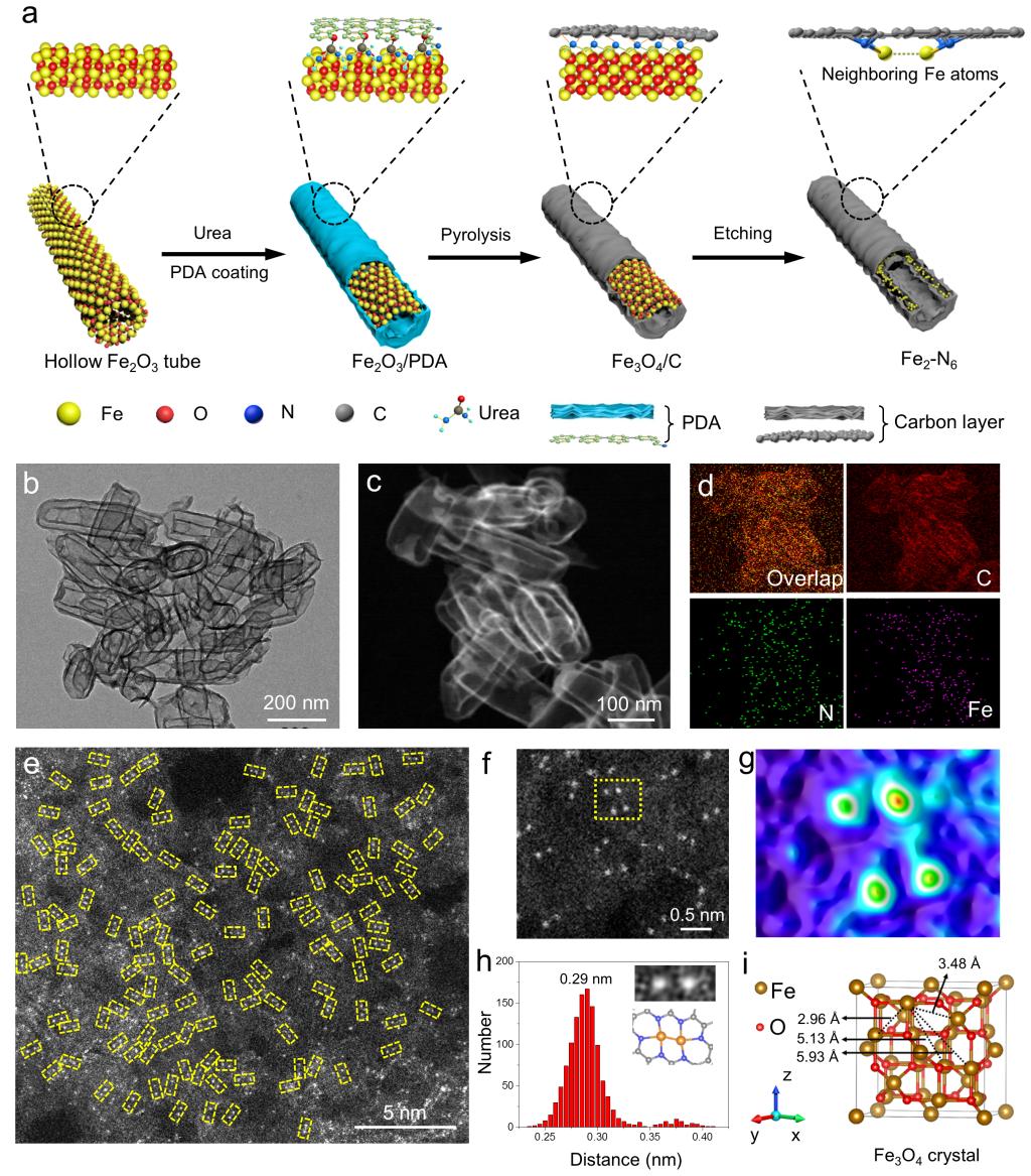 在四氧化三铁晶体单元中,铁原子之间有四种距离:2.96、3.48、5.13和5.93 埃。尿素高效地锚定了相距2.96埃的铁原子,形成具有近邻关系的铁-铁双原子对催化剂。该催化剂中具有近邻关系的铁-铁原子对纯度高达98%,铁原子的质量比含量为2.36%。
