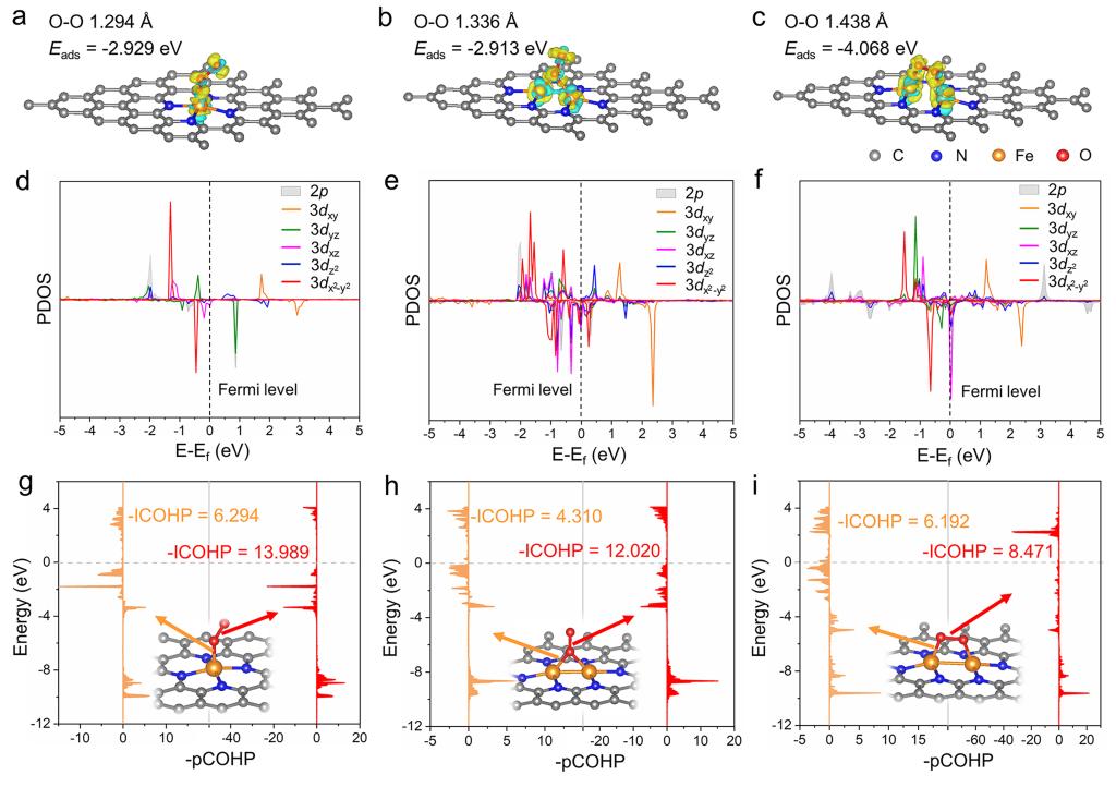 通过密度泛函理论计算分析了铁基催化剂中的氧还原反应机制,发现氧氧双键的活化是反应的速率决定步骤。氮配位的铁单原子和氮配位的铁-铁双原子对的氧分子吸附构型表明,氮配位的铁-铁双原子在平行吸附模式下对氧气的活化最为有效,具有更强的化学吸附能力和显著减弱的氧氧键。自旋极化态密度分析显示氮配位的铁-铁双原子对的d带中心更接近费米能级,表明更强的吸附能力。进一步分析表明,氮配位的铁-铁双原子对在平行吸附时,氧氧键显著减弱,促进了氧的活化。