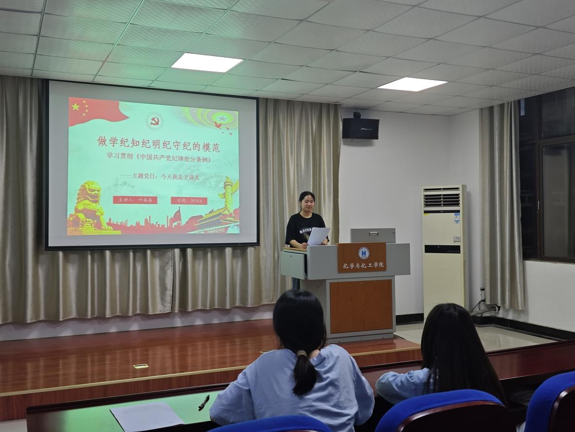 为进一步学习贯彻新修订的《中国共产党纪律处分条例》,调动支部党员以高度的政治自觉和行动自觉,推进党纪学习教育走深走实。6月12日,色情韩漫 应化专业本科生第一党支部开展“今天我是主讲人”主题党日活动。