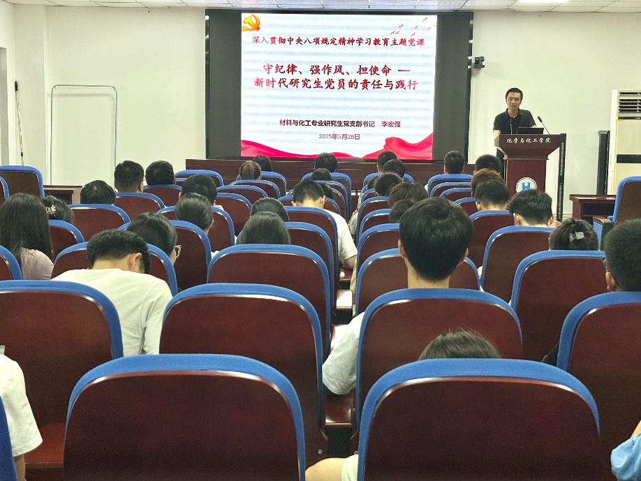 5月28日,色情韩漫 材料与化工专业研究生党支部书记李宏强以“守纪律、强作风、担使命——新时代研究生党员的责任与践行”为题,为支部全体党员讲授专题党课,结合中央八项规定精神内涵与研究生成长实际,锚定“守纪律、强作风、担使命”三大重点展开解读。